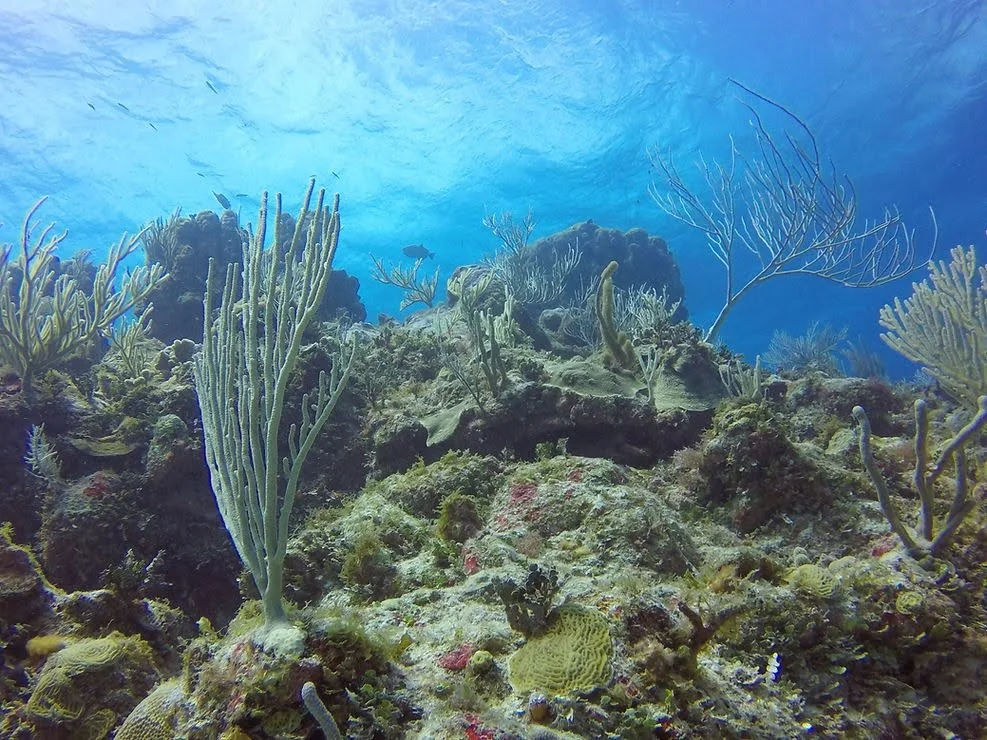 A view of the beautiful underwater scenery of Belize's coral reefs, with hard corals, algae, sponges and soft corals all competing for space while a triggerfish cruises in the background. Monitoring the health of reef-building hard corals is a key part of Blue Ventures' work. Credit: Olivia Clayton.