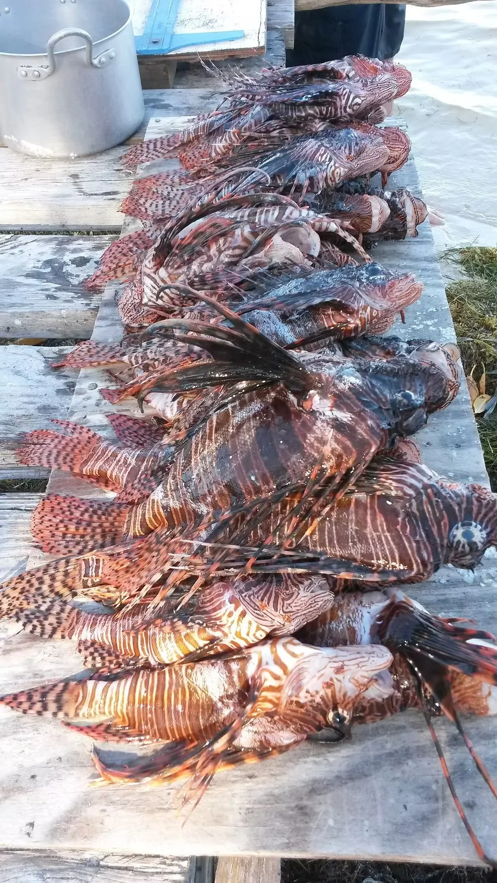 Invasive lionfish (Pterois volitans) speared on a culling dive are lined up ready for dissection by Blue Ventures staff. Dissections are critical to improving our understanding of the lionfish problem, such as providing information on the prey species consumed by examining stomach contents. Credit: Henry Duffy.