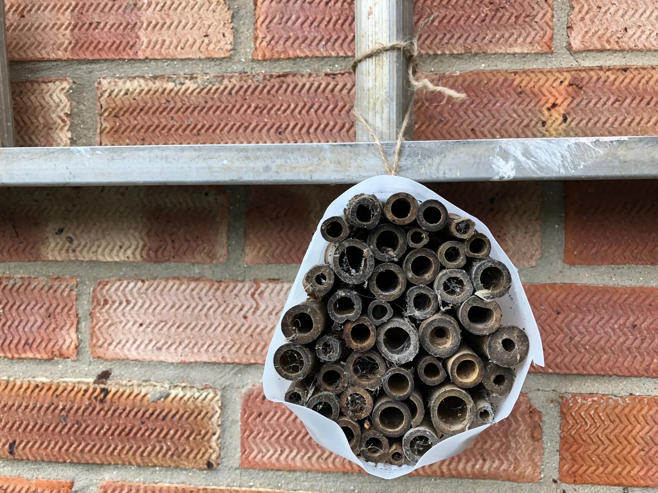 Tie some string tightly around the whole bee hotel to make sure the canes are held snugly in the container.