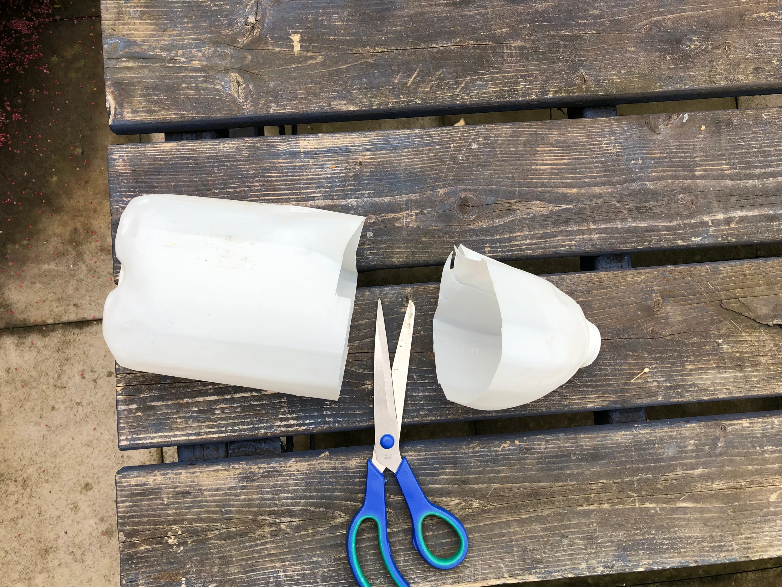 Cut the top off the plastic bottle using strong scissors (ask an adult to help with this). We are looking to create a container that is open one end and closed the other. It wants to be a bit more than 20cm or so deep so that it will overhang the entrances to the holes. Something with straight edges makes the following steps easier.