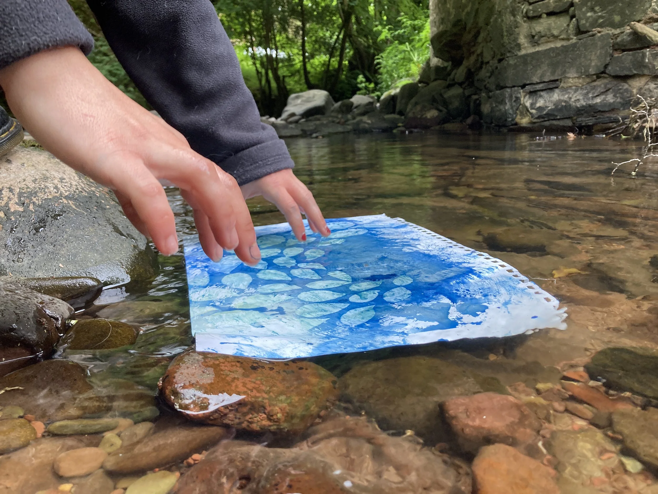 Having these sketches brought my emotion to visuals. With these visuals, I was able to conceptualise my textile piece. Cyanotypes were a perfect process for this piece, using the sun and water to create a print. They also happen to have a sentimental connection to Penpont for me. Photographer Andy Pilsbury taught us cyanotyping to create artwork from foraged foliage at an early visit to the site, connecting us to nature through creativity. I remember being so excited by the technique and cyanotyping one of the t-shirts I'd brought with me. It was old and I didn't wear it much, so I didn't care if I ruined it. However, I transformed it into a garment I now treasure. As do I treasure the memory.